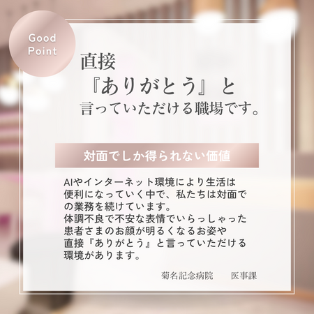 仕事内容 | 急性期型の病院における医療事務・医師事務作業補助者 受付・会計・診療報酬請求などを行っていただきます。 【部署の雰囲気】 未経験からスタートしている先輩、医療事務の資格を持っていない先輩もいますので、未経験の方でも大歓迎です! 先輩が近くにいるので、聞きながら少しずつ業務を身につけられるような職場環境です。 所属長との距離感も近いので、お休み希望やご家庭の事情などあっても遠慮なく相談できるので、ワークライフバランスを重視したい方におすすめです♪ |
