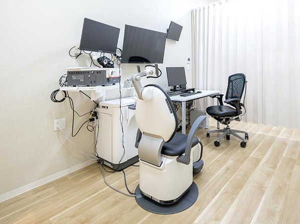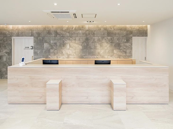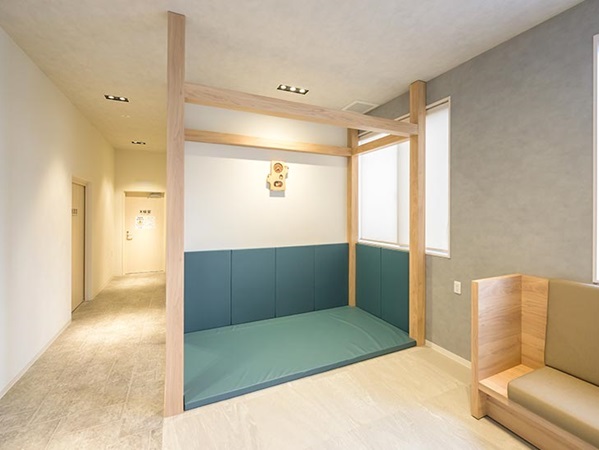 白やベージュを使った、開放的な明るい待合室です。キッズスペースも隣接しており、幅広い年代の方がリラックスして過ごせる空間となっています。