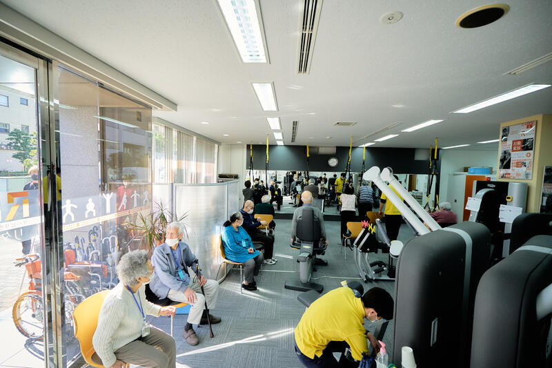 リハビリトレーニングは、鏡張りのワンフロアにて集団で行うため、利用者様から「みんなの姿が見えるので、自分も頑張ろうという意欲が湧いてきます」と言って頂いています。