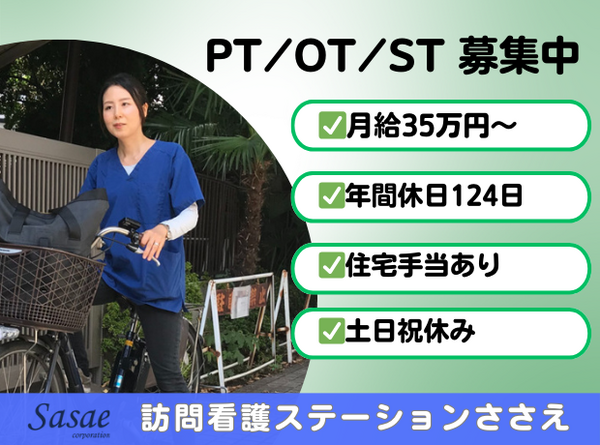 仕事内容 | 訪問看護ステーションでのリハビリ業務 1日5件を目標に、電動自転車で利用者様宅へ訪問し、専門領域の相談や援助を実践 <訪問看護ステーションささえでの言語聴覚士としてのお仕事> ◎発声・発語障害や嚥下障害の方、失語症等の高次脳機能障害・認知症の方への専門的な言語聴覚療法・摂食嚥下療法を行います。 具体的には・・・発音・発声エクササイズ、間接嚥下エクササイズ、直接接嚥下エクササイズ、各機能回復エクササイズ、回想法等の実施 ◎(小児)言語発達遅滞・発音未獲得の方への療育による言語機能獲得・発音の獲得 ◎医療・福祉専門職と連携しながら円滑なコミュニケーション、安全に食事ができるように支援する。 ◎バイタルチェックやフィジカルアセスメントなど一部看護業務 ◎社内で利用者の記録、医師・看護師への共有 必要に応じて次回以降のリハビリプランの相談を行います。 訪問手段 :電動自転車 訪問件数 :1日5件が目標です |