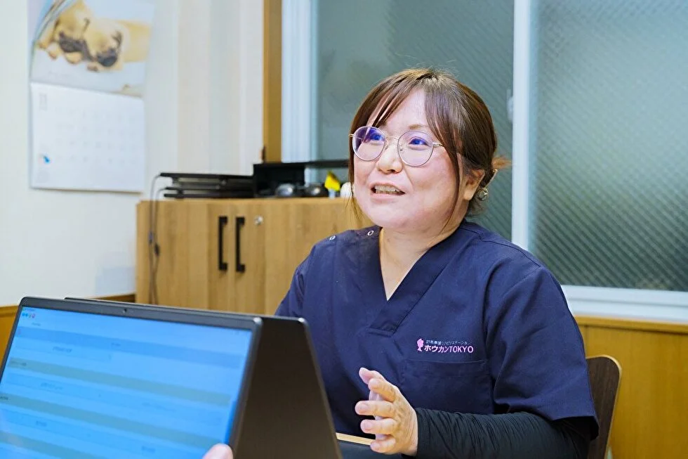 ホウカンTOKYOには年齢も経験年数もさまざまなスタッフがいて、それぞれ培ってきたスキルや知識を生かし、相談し合いながら働いています。だから、若さや経験の浅さを理由に遠慮せず、自分の強みに自信を持てる人ならきっと活躍できますよ。各々の強みを発揮しながら苦手な部分は補い合い、一緒により良いケアを考えていきましょう!